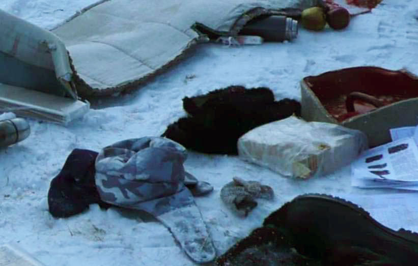 И здесь, и вообще на снимках, сделанных до начала растаскивания «реквизита», очень много бумаги – листов, пачек, стопок, папок. Которыми «героические сидельцы» Банных, Белинский, Капранов, теряя остатки тепла 40-градусными ночами, отапливая палатку даже «лыжами и частями вертолета», мужественно стремясь «сохранить жизнь раненым товарищам», почему-то пренебрегли. Одна вот эта картонная коробка, набитая бумагами, стоящая на зеленой вещице и предмете, похожем на шаль, наверное, могла бы отсрочить «обмороженным», переохлажденным» Банных, Белинскому, Капранову переохлаждение и обморожение на целый час.