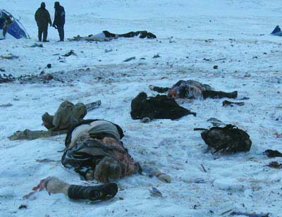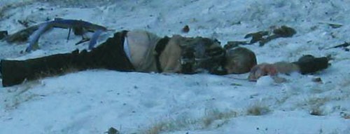 Сравните, каким образом ублюдки, орудовавшие на Черной горе, разложили животных – целое и половину. Сделали они это практически на том же месте и сориентировали в точности так же (эти жуткие пары раскладывались буквально в нескольких метрах одна от другой, животные – к юго-западу от людей). Напомним этот обошедший мир знаменитый снимок.