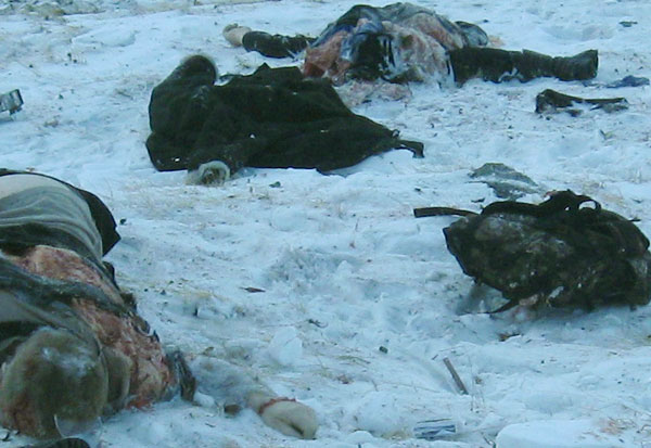 Состояние снега говорит: всю экспозицию «крушения» МИ-8 привозили и монтировали постепенно: сперва вертолет, потом тела, части тел и вещи – грудой, в палатке. Потом раскладывали в порядке, о котором мы написали: сперва оружие разложили, потом тела, потом баранов.