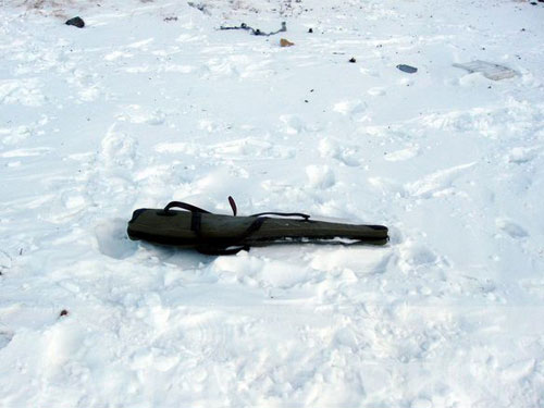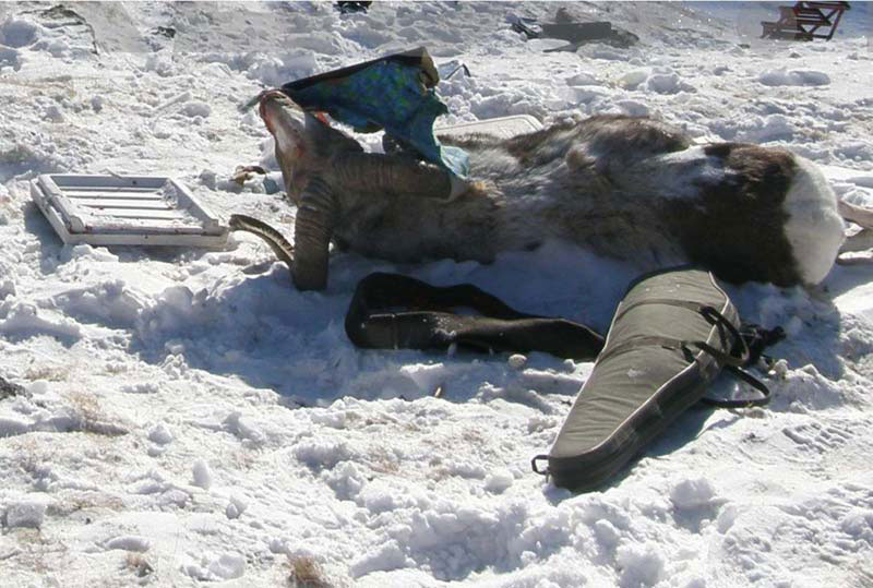 А с кейсом уже проделываются следующие манипуляции. Следующие два снимка, сделанные с интервалом менее секунды, показывают момент, когда псевдоспасатель в белых унтах разорвал остатки кейса и бросил на снег две части. Одна часть – прямоугольник с прокладочной тканью, которому суждено оказаться на рогах чучела архара, когда его сюда притащат. Другая часть – боковина и днище без прокладочной ткани.