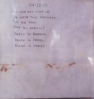 Для начала, давайте рассмотрим, как следует, письмо, которое было помещено в один из конвертов — вместе с собственно порошком сибирской язвы. Спасибо ФБР, которое сделало копию этого письма доступной публике, она до сих пор присутствует в Интернете. Вот она: