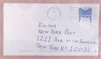 По странному стечению обстоятельств, следующей жертвой трусливого «Саддама Хуссейна» оказалась Нью-Йорк Пост. Газета получила красивый конверт, явно надписанный той же самой рукой, которая презрела исламские традиции, написав «Аллах велик» с маленькой буквы в примере, описанном выше:
