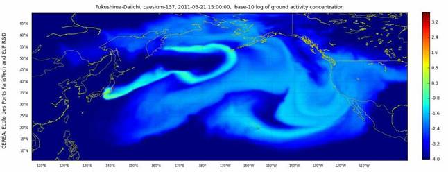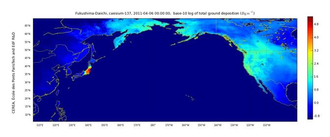 Модель распространения радиоактивных цезиевых осадков (Cs-137) в северной части Тихого океана на 6 апреля 2011 года; http://cerea.enpc.fr/en/fukushima.html