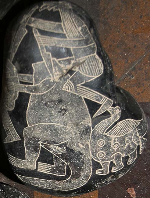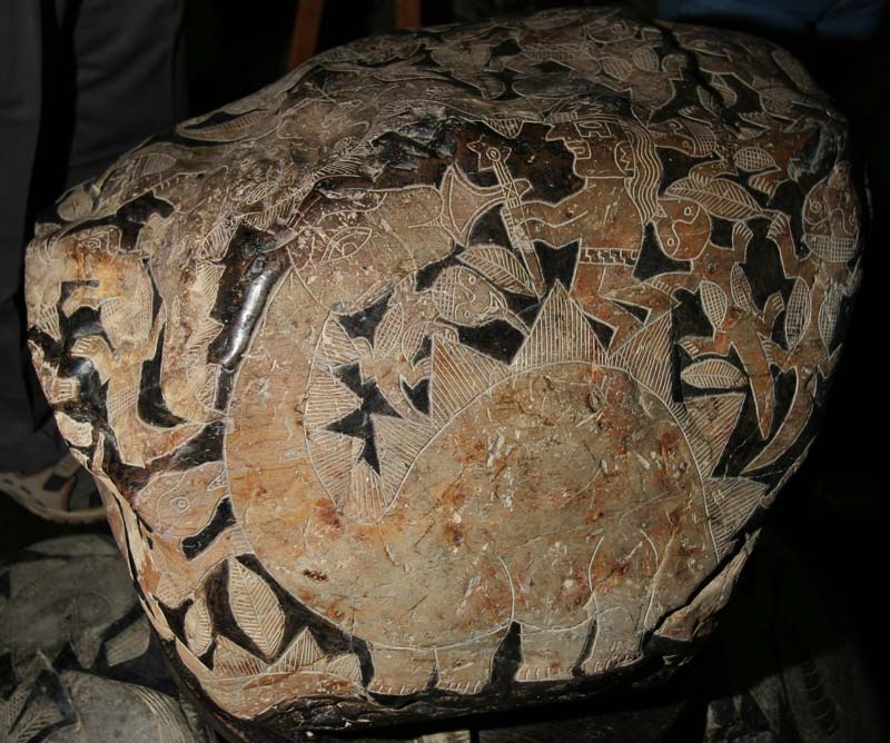 И еще один не менее интересный камень со сценой охоты (фото-IV). Охотник отрубил топором голову самке зауропода и достает из ее чрева уже полностью сформировавшегося, но еще не рожденного детеныша. Интересно, что сзади на охотника нападает хищный ящер, вероятно, очень крупный, т.к. на рисунке показано, что он успел проглотить второго человека. Характерно, что под брюхом самки также изображены парные молочные железы.