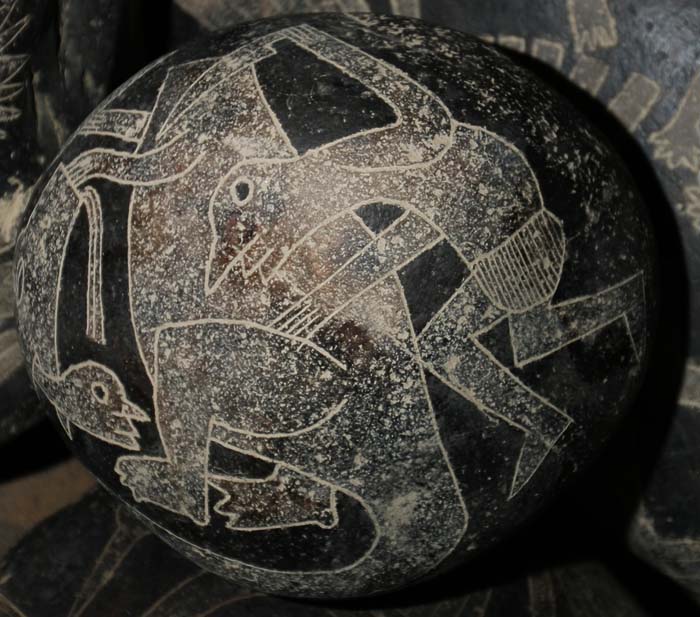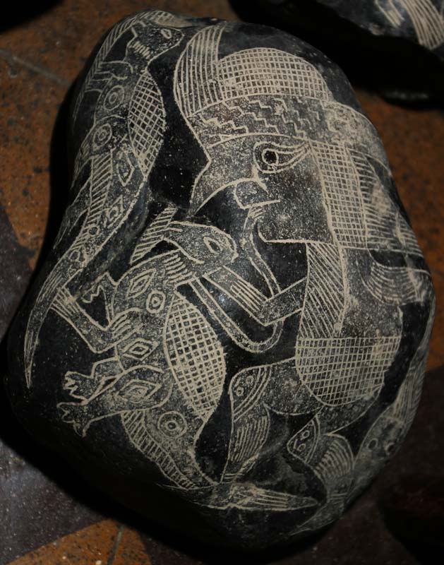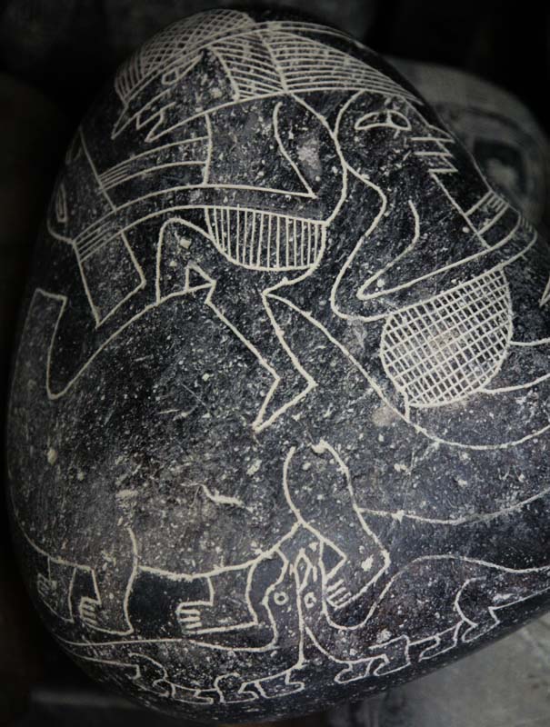 В собрании доктора Кабреры большинство камней со сценами охоты имеют средние размеры 20 – 30 см в диаметре. На них присутствует всего несколько персонажей – охотники и животное, иногда есть дополнительные фигуры животных, рептилий, птиц. В то же время в музее имеется несколько высокохудожественных камней, которые можно смело назвать валунами. Их размер варьируется от 50 до 70 см в диаметре, а пара таких камней имеет размер до 1 м. Поверхность таких камней покрыта гравировкой со всех сторон, а не только с одной, как на небольших камнях. Исполнение рисунков также отличается гораздо более тщательной проработкой деталей и более высоким художественным уровнем. Они отличаются сложной композицией, больше свойственной скорее изображениям на текстильных изделиях. Эти камня составляют, по сути, отдельную серию. На них изображена одна и та же сцена – охота на зауроподовых ящеров (фото-II). Рисунки на всех камнях этой серии повторяют друг друга во многих деталях. Так все ящеры-зауроподы изображены со спинными треугольными пластинами. Охотники имеют сложные головные уборы из перьев, детали которых очень тщательно проработаны. Люди используют только металлические топоры на деревянной ручке, при помощи которых пытаются поразить ящера в голову. В сцене обязательно присутствуют детеныши рептилий, изображенные по единому стандарту. Они показаны сверху и как бы распластаны. Примечательно, что в большинстве случаев морды детёнышей изображены анфас, а не в профиль (что в целом является редкостью для иконографии камней Ики), и им явно приданы антропоморфные черты. Однако головы некоторых детёнышей изображены в профиль и в них можно узнать тех самых зауроподовых ящеров, на которых и происходит охота (фото-II). Как правило, на этих камнях присутствует изображение солнца, которому также приданы антропоморфные черты. Все это позволяет предположить, что на камнях данной серии отражена очень важная сторона жизни этого древнего общества, связанная с взаимоотношениями людей и динозавров.