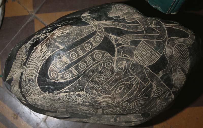 Здесь хотелось бы обратить внимание на еще одну из загадок литотеки Ики, связанную с древними ящерами. На одном из камней (Фото 38) показана типичная сцена охоты: два человека убивают зауропода, один уже успел отрезать рептилии голову. Сцена стандартная, если бы не одна загадочная деталь. Под брюхом ящера изображены два детеныша, которые сосут материнское вымя! Но ведь такой сюжет полностью противоречит всем представлениям о динозаврах, ведь рептилии не могут быть млекопитающими! Что это может означать? Как убеждает весь комплекс изображений на камнях Ики, древние художники, оставившие эти рисунки, работали в реалистичной манере. Рассмотренные выше изображения динозавров наглядно показывают нам, что представители древней цивилизации, оставившие после себя камни Ики, были прекрасно знакомы с разнообразными видами древних рептилий. Как будет показано ниже, они прекрасно знали, что динозавры являются яйцекладущими животными, а не живородящими. Тогда чем же можно объяснить данное изображение? Более того, такое изображение не является единичным. На другом камне довольно крупного размера также выгравирована сцена охоты на динозавров. Композиция на нем интересная и комплексная (фото-III): один из охотников сидит на спине зауропода, его голову венчает сложный головной убор, что говорит о его высоком социальном статусе. В пользу этого свидетельствует и то, что этот охотник изображен гораздо более крупно, чем второй, который, вероятно, является простым охотником. И динозавр успел его схватить своими зубами, которые, кстати, больше подошли бы плотоядному ящеру. Они уже умертвили детеныша динозавра традиционным способом – отрезав ему ножом голову. Сзади на первого охотника нападает хищный теропод, что также является типичным мотивом. Но дело в том, что у самки зауропода под брюхом изображена такая же пара молочных желез, как и на предыдущем камне. Более того, под хвостом самки изображен маленький детеныш, который, без сомнения, показан в процессе его появления на свет. В пользу этого говорит и сам характер рисунка: тело детеныша не отделено графически от тела самки. Они составляют единый контур, т.е. наглядно показано, что детеныш еще не до конца вылез из лона матери.