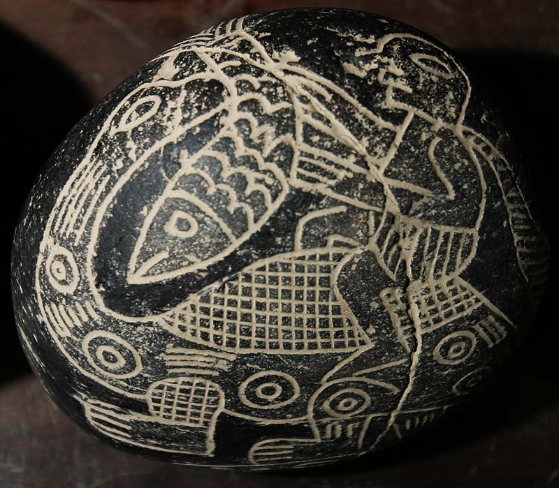 Взаимодействие представителей древней цивилизации, оставившей камни Ики, с динозаврами не было ограничено только охотой на последних. Целый ряд камней из собрания Кабреры наглядно демонстрирует, что человек использовал некоторые виды древних рептилий в качестве домашних животных. Чуть ранее было высказано предположение, что древние охотились на некоторые виды зауроподовых динозавров для того, чтобы получить их детёнышей и использовать их в научных целях. Но также можно предположить и другое: детёнышей забирали у матери, убивая ее, для того, чтобы превратить рептилию в домашнее животное, дрессируя ее с раннего возраста. В собрании доктора Кабреры есть несколько камней, рисунки на которых можно с уверенностью интерпретировать как сцены ухаживания за молодыми ящерами. Так, на одном из камней выгравирован человек и два небольших, явно молодых, ящера, каждый из которых держит в пасти лист растения (Фото 40). Интересно, что изо рта человека выходит полоса (трубка?), соединенная с головой одного из детёнышей. Смысл этого элемента понять сложно. Но, как будет показано ниже, аналогичные трубки постоянно изображались на камнях со сценами хирургических операций. В другой руке человек держит рыбу, которая явно предназначена в пищу ящерам. В пользу этого явно свидетельствует рисунок на другом камне, где человек кормит рыбой детеныша зауропода (Фото 41).