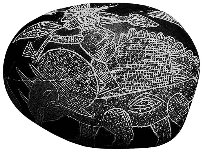 Об использовании динозавров в качестве домашних животных можно судить по ряду камней, хранящихся в музее Кабреры. Их немного, но на всех изображены различные виды древних рептилий, которых люди эксплуатируют в качестве верховых животных. На одном из камней наездник сидит верхом на рогатом ящере неизвестного вида, на другом – три человека оседлали зауроподового ящера, шея которого имеет треугольные пластины (Фото V). Динозавр показан в лежачем состоянии с подогнутыми ногами. На таких камнях на спинах ящеров обязательно изображены попоны. И еще один наиболее интересный камень, на котором выгравирован человек, едущий верхом на трицератопсе (Фото 42). В руке наездник держит курительную трубку, изо рта, по всей видимости, у него выходит дым. Спина ящера также покрыта попоной и, что крайне интересно, на спине трицератопса изображены невысокие округлые спинные пластины. Есть еще один камень, изображающий трицератопса, но уже с треугольными пластинами на спине, аналогичными тем, которые присутствуют на спинах зауроподовых ящеров. Изображение на этом камне выполнено в более совершенной манере, чем на предыдущем. Интересно также наличие в этой композиции детёнышей динозавров, показанных в разных стадиях своего роста (Фото 43).