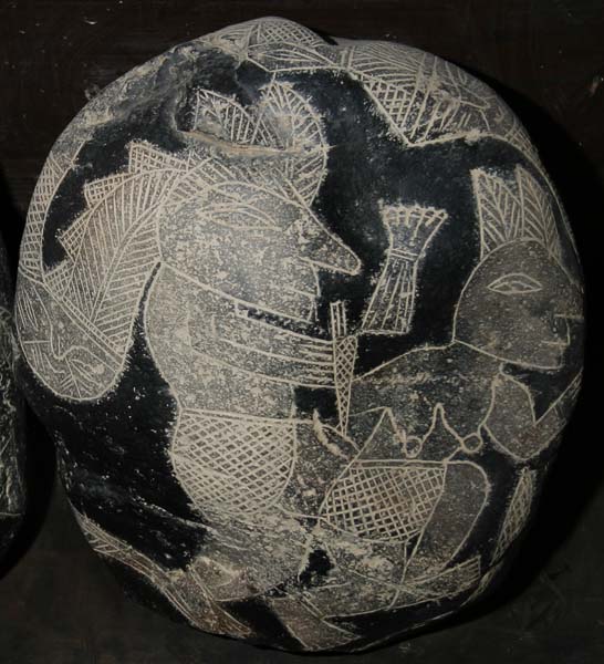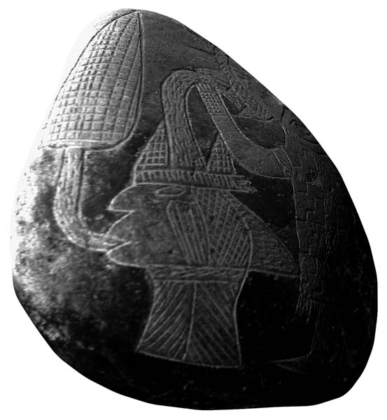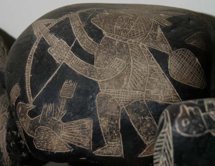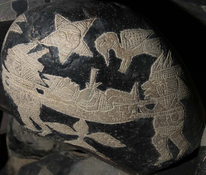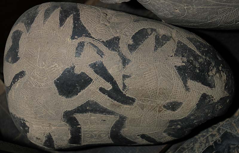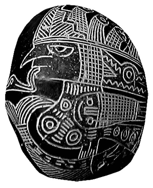 Очень интересен еще один небольшой камень из собрания доктора Кабреры (Фото 64). На нем изображена птица с человеческой головой (подробнее я остановлюсь на этом ниже). Примечательно совмещение в одном персонаже почти всех наиболее распространенных в иконографическом комплексе Ики символов. Во рту существо держит змею, изображенную очень схематично, в лапах – рыбу. В головной убор вписан символ «головы динозавра». Т.е. можно предположить, что приведенные на этом рисунке универсальные символы являются атрибутами этого «существа» - птицы с человеческой головой. И камни с таким изображением достаточно многочисленны в коллекции доктора Кабреры, но ни сам он, ни другие исследователи пока не уделяли им должного внимания.