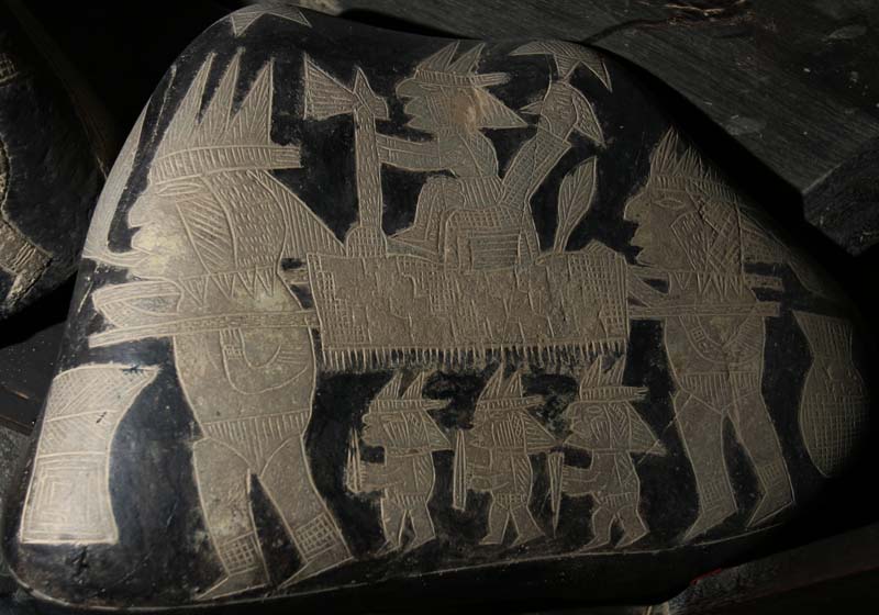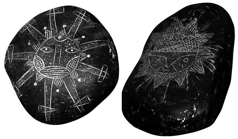 На некоторых камнях изображены культовые (праздничные) церемонии, например, на камне с процессией музыкантов с флейтами (Фото 72). Есть в коллекции доктора Кабреры и другие камни с церемониальными изображениями. Два из них отличаются высоким художественным уровнем гравировки и совершенно однотипным сюжетом изображения. Оба камня имеют также одинаковый серо-бежевый цвет. Коленопреклоненные жрецы в изысканных головных уборах обращаются, вероятно, с молитвой к солнечному диску (фото VII). Эти камни можно смело назвать одними из лучших образцов, представленных в комплексе Ики. Удивляет тщательная детализация изображений, прорисованы мельчайшие детали. Жрецы держат в руках церемониальные жезлы, звездчатые булавы и дротики. Не вызывает сомнения тот факт, что культ Солнца играл ведущую роль в мировоззренческой системе этой цивилизации. Ничего удивительного в этом нет, практически все древние общества можно отнести, условно говоря, к категории солнцепоклонников. На камнях Ики солнечный лик присутствует во многих сценах. Примечательно, что изображался солнечный диск в виде человеческого лица, что присуще не только древним культурам. В музее Кабреры имеется значительное количество небольших камней, на которых солнечный лик изображен отдельно, причем, в различных вариациях (Фото 73).