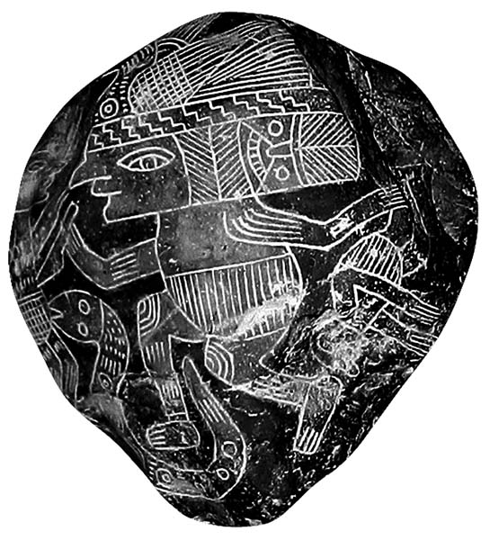 Что касается набора оружия, использовавшегося представителями этой неизвестной цивилизации, то он был достаточно ограничен и традиционен для большинства древних обществ. В военных действиях они использовали копье или дротик, топор, палицу, нож. Примечательно, что топор в комплексе рисунков на камнях Ики изображался наиболее подробно. Практически всегда можно увидеть ремни, которым сам топор крепится к топорищу, в редких случаях даже изображался рисунок на поверхности топора. Палицы, приведенные на рисунках, имеют традиционную для древних андских культур форму – они сделаны в виде звезды (Фото VII). Такие навершия палиц, выполненные из камня и бронзы, во множестве найдены в захоронениях инков и предшествующих им археологических культур. А вот лук со стрелами является большой редкостью в иконографическом комплексе камней Ики. На отдельных изображениях приведено его использование в качестве охотничьего оружия (Фото 69).