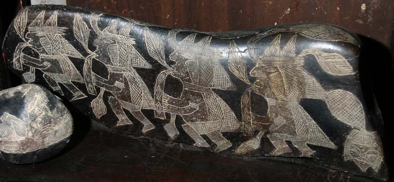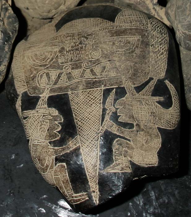 Есть также небольшой ряд изображений, которые можно было бы толковать как сцены военного столкновения. Но они весьма спорны. Так, на одном из камней изображена схватка двух воинов с топорами (Фото IX). Однако между воинами помещен ритуальный сосуд и можно предполагать, что здесь приведена именно культовая сцена. Не менее интересен и другой камень, на котором воин гонится за женщиной, изображенной в головном уборе, и ножом отсекает ей руку (Фото 67). Можно, конечно, было бы предположить, что здесь приведена сцена схватки с американскими «амазонками». Но если не давать волю фантазии, то интерпретация данного изображения может быть неоднозначной. Вполне возможно, что этот рисунок отражает какую-либо культовую или мифологическую сцену. К мифологическому (или историческому) сюжету, вероятно, можно отнести и еще несколько камней. На одном из них изображен воин в сложном головном уборе, увенчанном фигурой птицы (Фото 68). Одной рукой, держащей нож, он поражает врага, в другой – держит уже убитого противника. Враги изображены упрощенно - меньшего размера и без головных уборов. Примечательно то, что центральный персонаж сопровождается символом змеи. Не исключено, что на этих камнях отражены исторические или легендарные события, повествующие о завоеваниях, условно говоря, «змеиного» народа. Ведь неспроста символ змеи занимает столь важное место в иконографическом комплексе камней Ики.