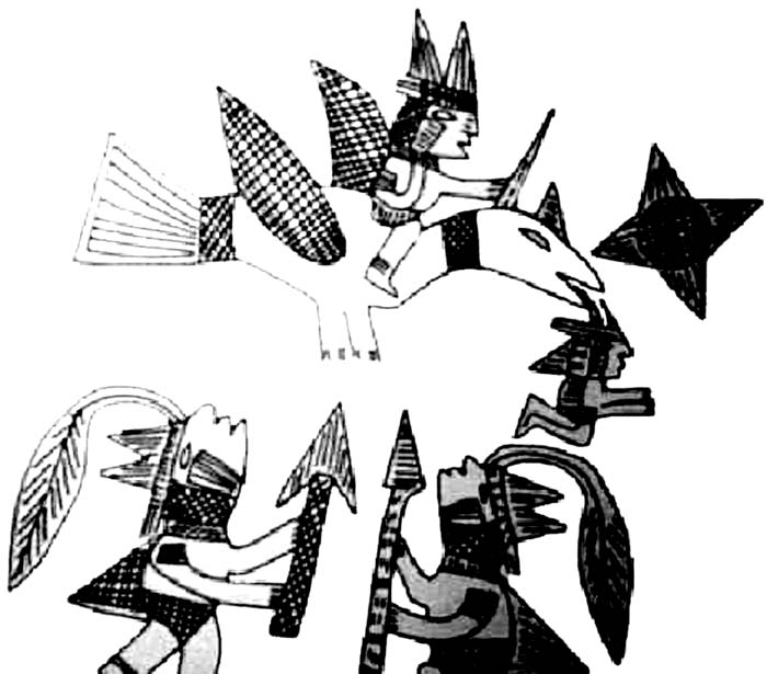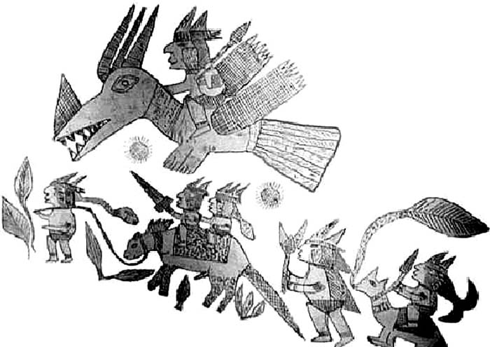 На одном из камней изображена сцена военного похода (рис.2). Здесь сразу бросаются в глаза несколько загадочных моментов. Прежде всего, вызывает недоумение тот факт, что один из всадников, сидящий на лошади (?) держит в руках меч. Но изображения меча на камнях Ики отсутствуют. Кроме того, в этой сцене изображен воин, летящий на огромной зубатой птице. Некоторые исследователи упоминали о том, что на камнях Ики есть изображения людей, летающих на динозаврах. Мне подобные рисунки не встречались. На данном камне, судя по хвостовому оперению, явно изображена птица, а не летающий ящер. Изображения людей верхом на громадных птицах встречаются в комплексе изображений Ика (рис.3). Но почти все камни с данной тематикой в настоящее время находятся в запаснике Музея аэронавтики в Лиме, посетить который мне не удалось. Поэтому здесь я привожу прорисовки с некоторых камней, сделанные еще в 70-е годы, которые удалось найти в Интернете. Точность прорисовок вызывает определенные сомнения. Возможно, отсюда – изображение меча, вместо, например остроконечного жезла, как на втором рисунке в руке у воина, летящего на птице. Здравый смысл не позволяет предположить, что представители этого древнего общества летали верхом на птицах, это как-то трудно согласуется с физическими представлениями о возможностях таких полетов. Быть может, такие рисунки являются отражением легендарных сюжетов, как и у других народов мира. В пользу такого предположения говорит и то, что на втором рисунке птица, несущая наездника, еще и держит в клюве другого воина. А полет на птицах - это лишь трансформированное за давностью лет воспоминание о летательных аппаратах. Или же восприятие древним художником чужого летательного аппарата. Никого ведь сегодня не удивляет эпитет «стальная птица» по отношению к современному самолету.