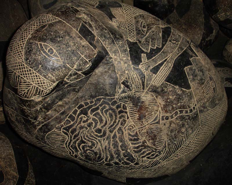 Следует напомнить, что Хавьер Кабрера был по специальности хирургом и почти до самой своей смерти занимался врачебной практикой. Поэтому вполне естественно, что камни с медицинской тематикой привлекали его особое внимание. В его собрании имеется две серии, каждая из которых содержит более десятка камней. Одна из них посвящена операциям по пересадке сердца, вторая – пересадкам полушарий мозга. Правда, назвать это полноценными сериями нельзя, поскольку камни отличаются и по уровню исполнения гравировки, и детализацией рисунков. Очевидно, что делали их различные мастера. Тем не менее, на этих камнях показаны различные стадии операций, что и позволяет сделать ряд интереснейших предположений. Необходимо отметить следующий факт. Большинство камней, на которых изображены пересадка сердца и мозга, являются большими. Некоторые превышают размеры метра в поперечнике и имеют вес около 300 кг (Фото 92). Т.е. камни с этими сюжетами (вместе с десятком камней с изображениями сцен охоты на динозавров) являются самыми крупными в коллекции доктора Кабреры. Их также отличает высокая степень детализации изображений. Можно предполагать, что древние художники придавали особое внимание именно данным сюжетам.