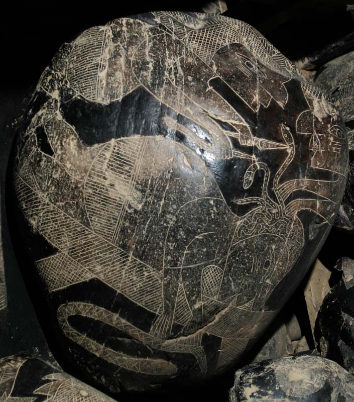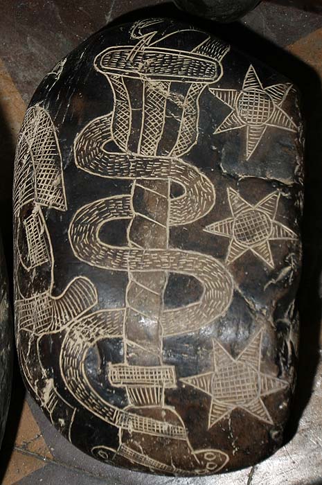 Кстати, о символах. В коллекции доктора Кабреры есть очень примечательный камень с уникальным рисунком. На нем изображен колоколовидный сосуд на длинной ножке, которую обвивает тело змеи. Голова змеи с раздвоенным языком глядит в чашу (Фото 97). Это ведь один из главных символов современной медицины, тем не менее, он присутствует в коллекции этих древнейших изображений. Что также интересно, сбоку от чаши нанесены изображения трех звезд, явно символизирующего взаимосвязь между искусством врачевания человека и устройством макрокосмоса. Конечно, именно этот камень можно было бы отнести к разряду «новоделов», имеющихся в коллекции Кабреры, хотя характер изображения змеи совершенно идентичен другим рисункам змеи, имеющимся в собрании. Но если мы исходим из принципа подлинности литотеки Ики, возникает интереснейший вопрос: насколько же древним является этот образ? И почему (каким путем) он стал одним из двух основных медицинских символов современной медицины?