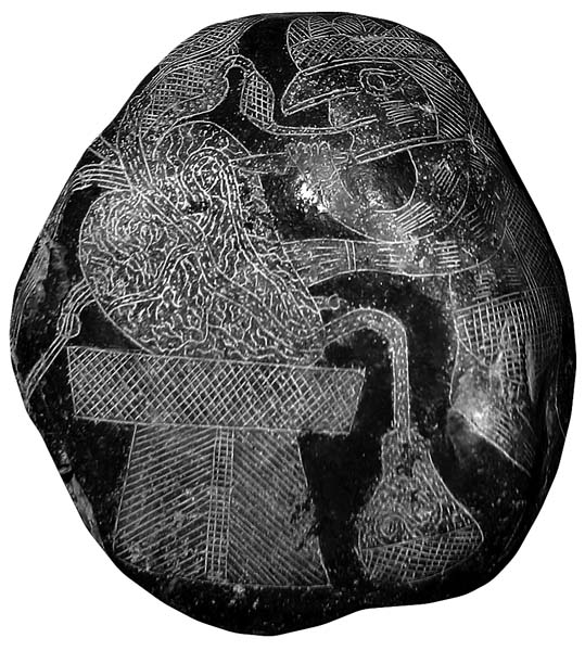 Характер данной операции не вызывает сомнений, поскольку вынимаемый плод изображен ногами вперед. Хирург, осуществляющий вскрытие брюшной полости женщины, также имеет на спине треугольные пластины. Среди десятка камней с изображениями хирургических операций мне попались два камня, отличающиеся от других одной специфической чертой. На них изображен пациент, лежащий на спине на медицинской скамье. И под скамьей идет такой же ряд треугольных пластин (Фото XIII). Предположение, что это именно спинные пластины пациента вполне оправданно, поскольку на подавляющем большинстве камней с изображениями лежащих на спине пациентов ничего подобного нет. Т.е. здесь можно обоснованно допустить, что на этих двух камнях показаны операции на людях со спинными пластинами.