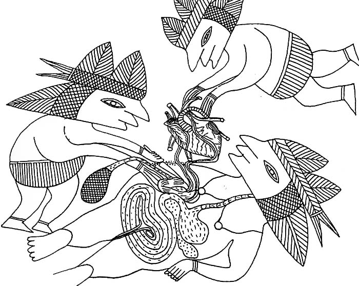 Особенно интересен один из камней, посвященных этому виду операций, на котором рисунок достаточно детализирован. Диаметр этого камня около 1 метра. На нем изображены два хирурга осуществляющие операцию по пересадке сердца (Фото XIV). Доктор Кабрера считал, что на этом камне изображен процесс орошения донорского органа кровью беременной женщины. Однако, изображение женщины на этом камне не дает оснований утверждать, что она беременна, поскольку среди тщательно прорисованных внутренних органов отсутствует изображение плода (Рис. 4). Доктор Кабрера пришел к выводу о том, что здесь изображена беременная женщина, на основе формы ее грудей. Т.е. в данном случае подобное предположение нельзя назвать достаточно обоснованным. Более того, по рисунку на этом камне нельзя с уверенностью сказать, изображено здесь извлечение донорского сердца или же, наоборот, его вживление пациенту. Само сердце выгравировано очень тщательно, со многими анатомическими подробностями. При помощи двух трубок оно, очевидно, соединено с другим органом женщины. По его изображению трудно сказать, что это за орган. Но, судя по местоположению и по тому, что его подсоединили к сердцу, можно предполагать, что это почка или печень. К этому же органу подсоединен аппарат для его орошения. Второй хирург при помощи ножа осуществляет какую-то манипуляцию с этим органом. Хотя по рисунку нельзя с уверенностью сказать, подсоединено сердце к другому органу, или же оно подсоединено к кровеносной системе женщины. Т.е. по данному рисунку нельзя сделать однозначные выводы о конкретных действиях врачевателей. Но само по себе такое подробное изображение сложнейшей операции, возможно, по пересадке сердца, вызывает изумление. Если говорить о камнях Ики как грандиозной мистификации то тогда трудно себе представить, что подобные методики трансплантационной медицины могли прийти в голову местным крестьянам, которые якобы изготавливали сами эти камни.