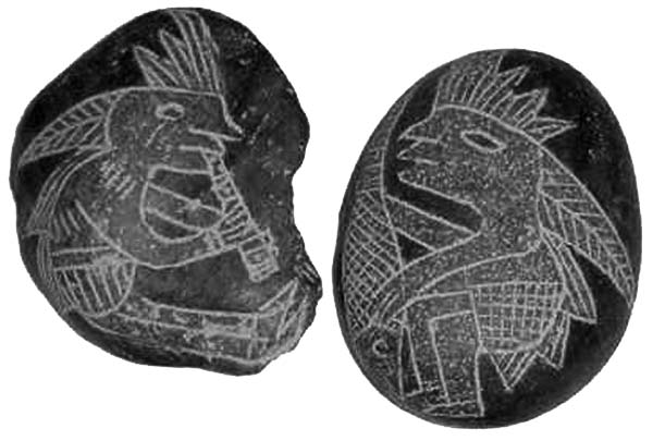 Это еще одна из многочисленных загадок камней Ики. Можно было бы скептически предположить, что ничего загадочного здесь нет, а таким образом изображены плюмажи из перьев, опускающиеся до земли. Но, во-первых, на подавляющем большинстве камней с медицинской тематикой таких громоздких головных уборов нет. Во-вторых, в иконографическом комплексе камней Ики перья в головных уборах заштрихованы по-другому. Треугольники с частой косой штриховкой обозначают именно костяные пластины, как у динозавров, так и у человека. И в собрании доктора Кабреры есть несколько маленьких камней с изображениями таких странных людей. На этих рисунках ясно видна разница между изображениями перьев головного убора и спинных пластин (Фото 98).