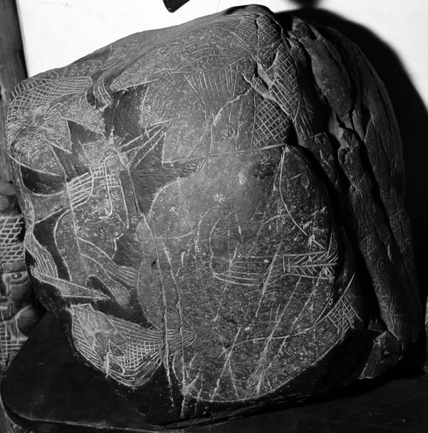 А вот смысл сюжета на другом камне уже не столь ясен (Фото XXIII). То же характерное изображение лунного диска, рядом с которым помещен человек, вооруженный копьем и топором. Причем, топором человек перерубает символ «листа жизни». Можно было бы предположить, что здесь приведен какой-либо мифологический сюжет, но тогда почему лунный диск изображен в астрономической манере – с символами морей и гор?