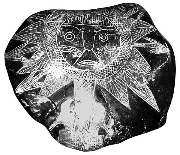 В литотеке Ики очень многочисленны изображения Солнца, и присутствуют они на камнях с различными сюжетами. Это вполне естественно. При всем разнообразии таких изображений, солнечный диск всегда показывался в виде человеческого лица, в отличие от Луны, изображенного анфас (Фото 102). Изображение «солнечного лика» - явление типичное для многих древних культур и это не простой антропоморфизм, якобы присущий «примитивному и религиозному» мировосприятию.