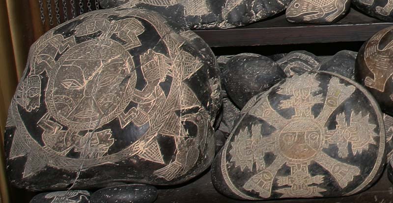 В коллекции доктора Кабреры имеется еще один маленький камушек, полностью повторяющий описанный астрономический сюжет. Он даже имеет аналогичную форму, хотя его размер не превышает 20 см (Фото 101). Судя по характеру изображения, можно предположить, что это одна из более поздних копий. Здесь также выгравированы фигуры астрономов, наблюдающих в подзорные трубы за звездным небом. У ног одного из них расположен рисунок трех горных вершин и двух «растений». Они напоминают символ, присутствующий на большом камне, но, похоже, что понимание этого символа было уже утрачено теми, кто делал эту копию. Среди небесных объектов, помимо луны, звезд, туманностей и комет, появляется символ солнечного диска. В целом в собрании доктора Кабреры имеется несколько десятков подобных маленьких камней с астрономической тематикой, сюжеты которых в значительной мере повторяют тот, что присутствует на большом («главном») камне. Трудно сказать, являются ли они более поздними копиями, либо были сделаны все одновременно, но разными мастерами. Этот вопрос, на мой взгляд, является одним из ключевых для понимания феномена камней Ики. Такая ситуация: наличие высокохудожественного крупного камня и множества мелких камней, копирующих рисунок основного, но выполненных гораздо грубее, применима ко многим сюжетам коллекции.