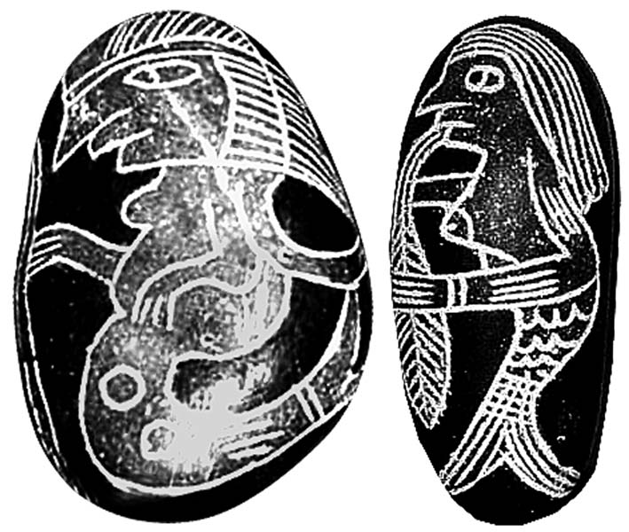 Камни Ики не перестают поражать обилием загадочных рисунков, чьи сюжеты, как оказывается, нам хорошо знакомы. Среди изображений различных фантастических существ, встречающихся в коллекции доктора Кабреры, можно обнаружить значительное число экземпляров, на которых выгравированы русалки. Это, как правило, небольшие камни галечного типа с одним единственным изображением. Кто такие русалки, мы знаем с детства, они упоминаются в мифологии и фольклоре большинства народов земного шара. На некоторых камнях русалки выгравированы в своем классическом облике – женщина с обнаженной грудью, длинными волосами и рыбьим хвостом (Фото 104). На хвосте явно изображены чешуйки. В руках русалка держит символический «лист жизни». Может на камнях Ики русалки изображались как мифологические создания?