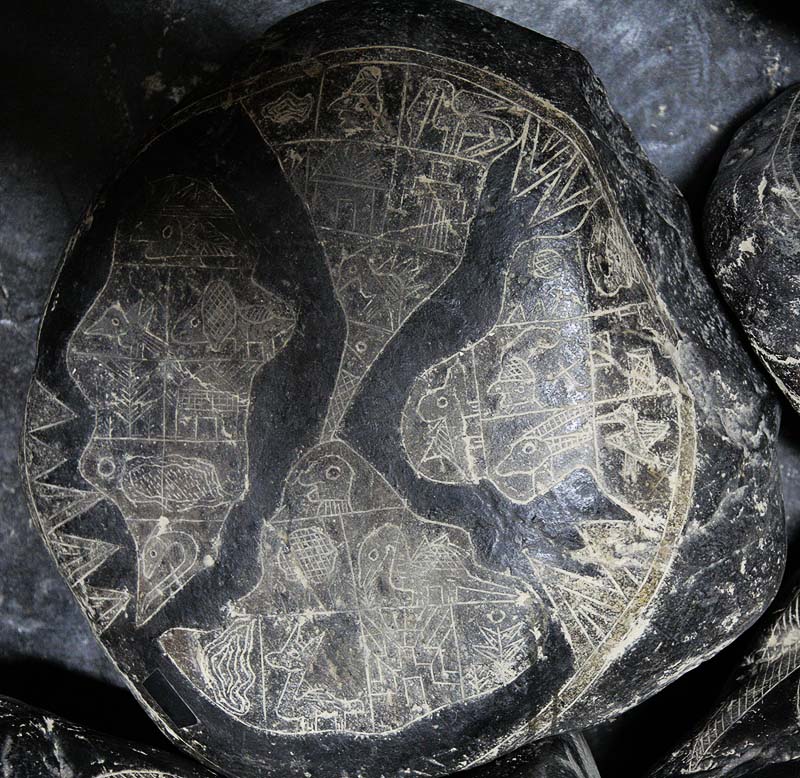 В отдельных зонах изображены люди, обозначая, по-видимому, заселенные территории. На одном камне (Фото 107) в зоне соответствующей территории современного Камеруна изображены два человека в головных уборах, обращенные лицом друг к другу. Между ними помещено изображение круга с точкой посередине. Это легко узнаваемый универсальный символ, в большинстве человеческих культур обозначавший Солнце. Интересно, что на территории к северу от описанной зоны нет символов живых существ или растений, только несколько абстрактных значков. Т.е. можно предположить, что в запечатленный на этом камне период истории планеты север Африки также покрывала огромная пустыня. Таким образом, изображенные детали рельефа вполне соответствуют современным.