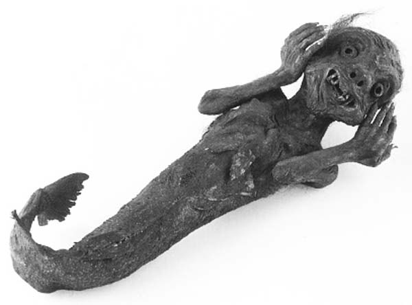 Помимо устных и письменных свидетельств существуют и более убедительные данные, отмахнутся от которых, списав все на фольклорные фантазии, уже невозможно. Еще в 1758 году. живую русалку демонстрировали на потеху публике на ярмарке Сен-Жермен в Париже. Художник Сью Готье сделал ее зарисовку с натуры. В 1830 году мумия русалки была выставлена в Британском музее Лондона. Еще две мумии русалок хранились в Королевском медицинском колледже в столице Англии. Во время Второй мировой войны в здание колледжа попала немецкая авиабомба, и коллекция погибла. Однако остались фотографии этих мумий. Мумии русалок сохранились в Королевском шотландском музее, в Лейдене в Национальном музее этнологии (Фото 105), в краеведческом музее г. Тумстоун (США). Их можно увидеть своими глазами.