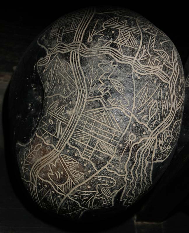 Особого внимания заслуживает небольшая серия камней в коллекции доктора Кабреры с изображениями материков. Даже на первый взгляд не возникает сомнений, что это географические карты. На данных камнях изображены материки, оконтуренные почти геометрически правильной окружностью – «границей мира». Таких камней в музее имеется четыре (Фото XXVI, XXVII, XXVIII и XXIX), все они имеют сходные параметры. Все четыре камня по своим размерам одинаковы, их диаметр - примерно 70 - 80 см. Стилистика изображений на всех камнях одна и та же, хотя уровень детализации рисунков различен, и это позволяет предположить, что рисунки были исполнены разными мастерами и, возможно, в разные времена. Самое главное заключается в том, что большинство континентов, изображенных в данной серии камней, не имеют сходства с контурами современных материков.