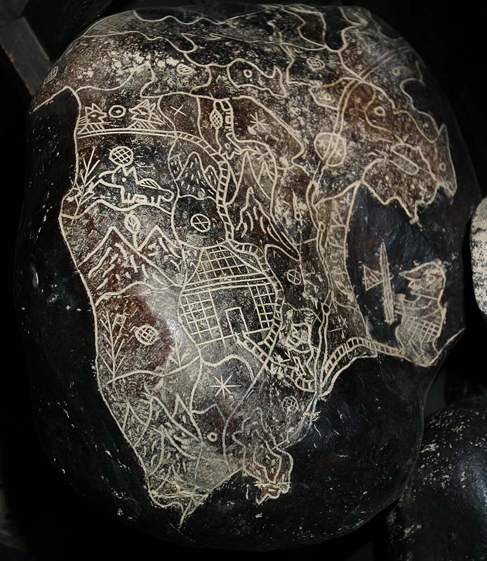 На другом камне (Фото 108) африканский континент покрывает сетка из параллельных полос, таких же, как и изображенные камнях с картами первого типа. Поэтому вряд ли будет правомерным предполагать, что такие полосы обозначали на данных камнях границы литосферных плит. Кстати, на одном из камней первого типа, где есть такие линии, можно наблюдать сходную картину (Фото XXVI). Здесь два из четырех материков разделены такой же волнообразной линией сверху вниз. Два других материка, равно как изображения остальных континентов на других камнях с картами, таких линий не имеют.