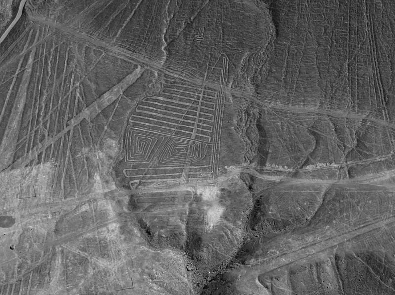 Я не буду подробно останавливаться на описании комплекса геоглифов Наски-Пальпы, этому посвящены сотни трудов многочисленных исследователей. Здесь же нас интересует связь рисунков Наски с камнями из собрания доктора Кабреры. Серия изображений рисунков Наски на камнях Ики достаточно ограничена. Но ее анализ позволяет выявить ряд любопытных особенностей. Во-первых, как уже упоминалось, в коллекции доктора Кабреры имеются только копии рисунков плато Наски, другие графические объекты с этого плато отсутствуют. Возможно, это связано с тем, что рисунки, судя по тому, что они перекрыты линиями и полосами, являются более ранними, и создатели литотеки Ики наносили свои изображения в то время, когда линии в Наске еще не были нанесены. Но это всего лишь предположение.