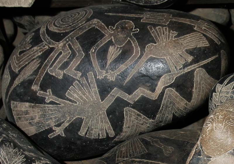 Во-вторых, набор рисунков на камнях ограничен, здесь можно встретить только треть объектов из известных на плато Наска. Это фигуры обезьяны, странной птицы «змеешейки», собаки, паука, кондора, ящерицы и колибри (Фото 111). Причем, обезьяна представлена наиболее массово, как на камнях с комплексными изображениями, так и отдельно на маленьких камушках. Почему остальные рисунки не были отображены в комплексе камней Ики? Или они просто не попали в собрание доктора Кабреры?