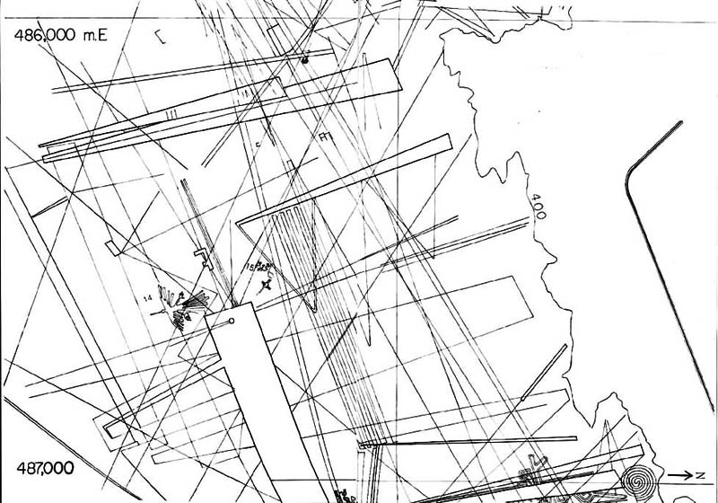 Линии и полосы многократно пересекают друг друга, полосы накладываются на рисунки, геометрические фигуры пересекают полосы. Это говорит о том, что комплекс Наски покрывался изображениями не единовременно, а в несколько этапов. Но при этом сделанные позже линии не уничтожают контуров геоглифов, оказавшихся под ними (Фото 109). Как это возможно, ведь когда одна «траншея» пересекает другую, понятно, что она должна уничтожить границы предыдущей. Но в Наске это происходит далеко не всегда. Только когда на рисунок накладывается полоса в несколько десятков метров шириной, контуры более ранней фигуры пропадают.