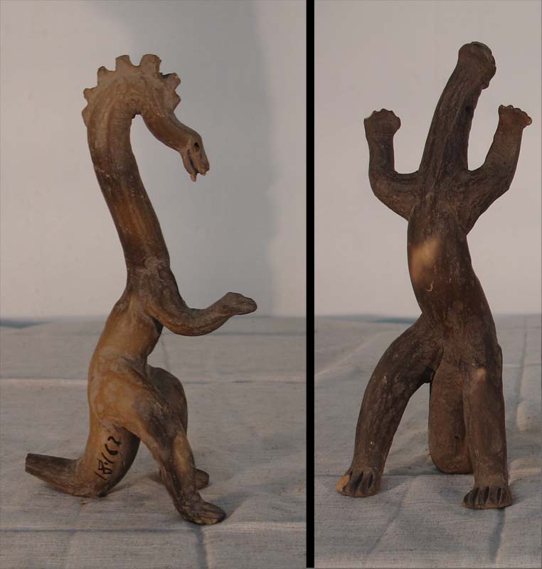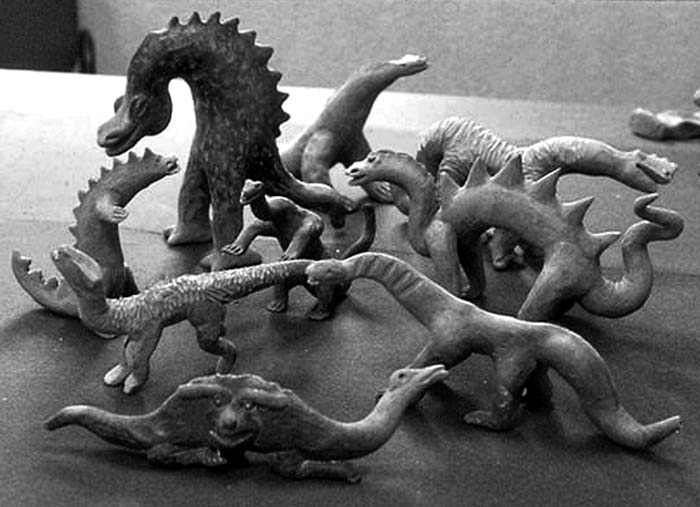 В собрании имеется целый ряд скульптур зауроподовых динозавров, стоящих на задних ногах (Фото 139). Опять-таки, только в конце ХХ века палеонтологи пришли к выводу, что эти древние гиганты без труда вставали на задние, более мощные ноги, и кормились таким образом молодыми побегами на верхушках деревьев. Что, неужели и такую возможность предвидели мексиканские «фальсификаторы», якобы фабриковавшие эти вещи в середине прошлого века?