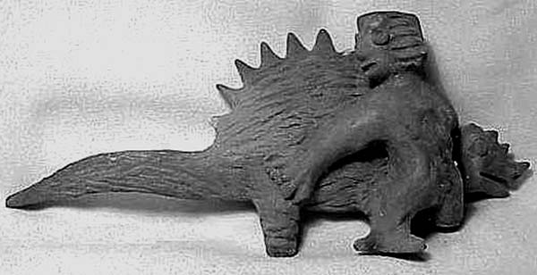 Кроме того скульптуры мексиканских динозавров демонстрируют большое разнообразие этой части тела. Кожистые образования имеют различные формы. Есть треугольные и ромбовидные спинные пластины, есть пластины, загнутые вперед, а не назад. У многих скульптур изображены не пластины, а конические спинные шипы. Этих шипов может быть один ряд, а может и три. Есть скульптуры со спинными «парусами», характерными для многих известных видов древних ящеров. Некоторые фигуры имеют кожаные пластины не только на задней, но и на передней части шеи. У других на спине вместо пластин имеется длинная грива. Впрочем, я не буду здесь подробно останавливаться на рассмотрении коллекции Вольдемара Джульсруда, поскольку ей будет посвящена следующая книга. Но несколько характерных моментов необходимо подчеркнуть.