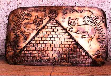 Изображения на таких пластинах не имели ничего общего с культурными традициями древней Америки. Они имели прямое отношение к культурам Старого Света, а точнее, цивилизациям средиземноморского бассейна и Ближнего Востока. Так на одной из пластин была изображена правильная (не ступенчатая) пирамида (Фото 145). Следует обратить внимание, что это изображение не так уж и схематично, показаны ровные ряды каменных блоков, из которых пирамида сложена. Обращает на себя правильная форма изображенной пирамиды, неизвестная в доколумбовых культурах Америки. Это хорошо узнаваемая классическая форма, характерная для древнеегипетских сооружений. Подобных пластин с изображением правильной пирамиды в коллекции Креспи несколько десятков. По нижнему краю этой пластины идет надпись, выполненная неизвестным «алфавитом». В нижних углах изображены два слона. Понятно, что слоны к моменту возникновения в Америки первых цивилизаций уже не водились. Но их изображения отнюдь не единичны в собрании Креспи. Неизвестный «алфавит», которым выполнена надпись, встречается и на других предметах. Данный вид письменности не известен современным исследователям. На первый взгляд он имеет определенное сходство с письменностью Мохенджо Даро. На других пластинах встречается другой вид письма, который, по мнению редких исследователей, напоминает либо ранне-ливийское, либо прото-минойское письмо. Один из американских исследователей собрания Креспи предполагал, что надписи выполнены «нео-пуническим» или же критским письмом, но на языке кечуа. Однако мне не известно о каких-либо серьезных попытках дешифровки этих надписей. Очень небольшое количество исследователей, в основном из США, пытались заниматься изучением собрания Креспи. Большой интерес к нему проявили представители мормонской церкви США, но драматическая история собрания падре Креспи не позволила провести какие-либо серьезные исследования.