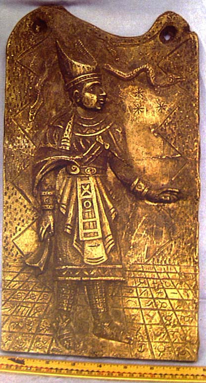 Представители официальной науки попросту игнорировали это собрание. А некоторые представители церкви заявляли, что все вещи – современные изделия местных крестьян. При этом (по некоторым обрывочным данным) многие вещи из собрания падре Креспи после его смерти были тайно вывезены в Ватикан. Естественно, что идущие вразрез официальной концепции данные игнорируются или замалчиваются. Но огромное количество предметов в собрании Креспи заставляют переосмыслить наши представления о контактах Старого и Нового Света в глубокой древности. Интересно, что в собрании имелись металлические накладки, изображающие хорошо известных крылатых быков из дворца Ниневии, а также крылатых грифоголовых «гениев», являющихся яркими образцами древневавилонского искусства. На одной из пластин изображен жрец в тиаре, аналогичной папской или же, напоминающей корону Нижнего Египта (Фото 146). На огромном количестве пластин обязательно присутствует изображение извивающейся змеи – символа космического змея. Большинство пластин имеют по углам отверстия. Очевидно, пластины служили для облицовки деревянных или каменных предметов или стен.