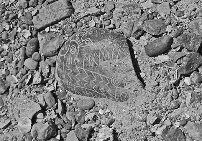 Более того, после того как контакт был налажен, Учуйя организовал для испанских гостей раскопки недалеко от поселения Окукахе. Можно предположить, выбранное им место у подножия холма Ла Пенья, было им хорошо разведано. В течение нескольких дней раскопок, которые осуществляли двое сыновей Базилио и еще двое молодых помощников, ими было найдено пять гравированных камней. К сожалении, все находки происходили на территории могильника, который, по-видимому, был уже давно разграблен. Поэтому камни были обнаружены не в погребениях, а в нарушенных слоях, возможно, в отвалах предыдущих раскопок. Но один из камней был найден в разрушенной стенке погребения. И он был завернут в обрывок древней ткани, частично даже сохранившей рисунок. На этом камне присутствовало очень стилизованное изображение летательного аппарата (Фото 7). В коллекции доктора Кабреры имеются десятки камней с подобными изображениями (о них будет речь ниже). Еще на одном камне была изображена сцена хирургической операции (Фото 8).