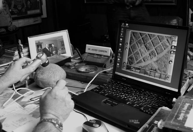 Во время нашей поездки в Перу в 2004 году Деннис Свифт брал с собой портативный полицейский микроскоп с двухсоткратным увеличением. Исследования сорока камней, проведенных прямо в помещении музея, дали аналогичные результаты (Фото 10). Гравированные бороздки имели глубину 0,7-0,9 мм, имели ровные края. Параллельные линии выглядели так, как будто их наносили по шаблону сетки или, как минимум, по линейке. Никаких следов карандаша, которым якобы «фальсификаторы» наносили на камни предварительные эскизы (и такие заявления я встречал в статьях скептиков и «разоблачителей») обнаружено не было. Равно как в бороздках не было обнаружено каких-либо микрочастиц металла, остающихся при резьбе соответствующими инструментами. Зато в микроскоп было прекрасно видно, что бороздки гравировки имеют точно такой же слой оксидной патины, как и вся поверхность камня.