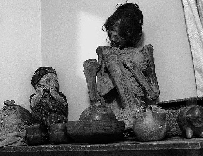 Семья уакерос с простой испанской фамилией, соответствующей нашей фамилии Ивановых, живет в двухэтажном домике и владеет еще небольшой «дачкой» на окраине города. Мы ходили к ним в гости три дня подряд и прониклись взаимной симпатией друг к другу. Поэтому мне удалось получить некоторую информацию, что называется, из первых рук. Несмотря на нелегальный характер бизнеса, весь дом был уставлен предметами древних индейских культур. На стенах в коридорах были подвешены полихромные керамические сосуды, в нишах стояли изделия из дерева, металла и керамики. На некоторых стенах висели древние плащи и пончо из раскрашенной шерсти. На даче в углу спокойно размещалась пара хорошо сохранившихся мумий (Фото 11). И все эти вещи имели почтенный возраст примерно в полторы тысячи лет.