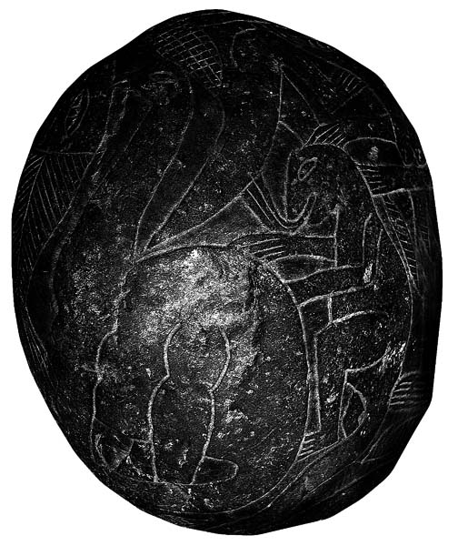 Но самое главное заключалось в том, что в этой домашней коллекции я увидел три камня с гравированными рисунками, и на всех были изображены динозавры. Все три камня были характерного серого или бежевого цвета и имели типичные средние размеры – 30-40 см в поперечнике. Их обнаружили на разных могильниках в окрестностях города Ика. Два были найдены в погребениях, а третий – случайно, на территории разграбленного некрополя. Уакерос, раскопавшие захоронение раньше, просто выбросили его, т.к. камень был покрыт слоем грязи и на нем не был виден рисунок. Все три камня имели не одиночные изображения, но жанровые сцены. На одном была изображена достаточно редкая сцена охоты хищных динозавров на крупного ящера подотряда (подгруппы ) зауроподовых (Фото 12). Второй камень изображал мужчину в характерном головном уборе из перьев, держащего в руках змею и маленького динозавра на другой стороне. И, наконец, третий оказался наиболее примечательным. На нем изображена сцена преследования (?) динозавра человеком (Фото 13). Древняя рептилия по внешнему виду явно может быть отнесена к подотряду зауроподовых, но при этом имеет две нехарактерных особенности – пару прямых рогов на голове и мужской половой орган. К вопросу о фальсификаторах: какой человек, будучи в здравом уме, сделает подобный противоречивый рисунок на камне, чтобы выдать его за подлинную древность? На обратной стороне камня изображена крупная птица, клюющая динозавра, который сражается с человеком. На лицевой стороне этого камня хорошо видны несколько черных пятен. Когда я спросил об их происхождении, мне сказали, что это – органические остатки веревок, которые лежали поверх камня в погребении. Камень просто не стали тщательно чистить. Этот камень был найден неподалеку от г.Наска в типичном погребальном комплексе культуры наска, датируемом примерно серединой I-го тыс. н.э.