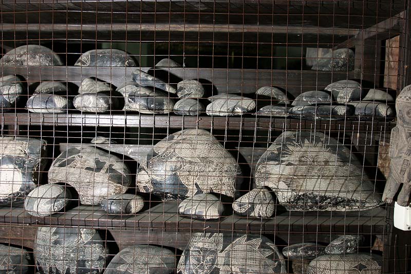 Перевезя свое собрание камней Ики в собственный особняк на Пласа дель Армас, доктор Кабрера оборудовал под него четыре комнаты. Большую часть камней он разместил на стеллажах вдоль стен. Крупные камни были расположены на полу. Кабрера осуществил первичную сортировку своей коллекции, разложив камни по сюжетам. Так, на одних полках разместились камни с изображениями вымерших животных, на других – со сценами жизни древнего общества, на третьих – с отдельными символами и т.д. Некоторые полки с маленькими камнями сегодня забраны металлической сеткой (Фото 19). Но сказать, что в музее предприняты какие-либо серьезные меры охраны нельзя. Двери просто закрываются на обычный замок. Войдя внутрь, сразу же попадаешь в комнату, буквально, заваленную гравированными камнями. Крупные камни лежат без определенной системы, иногда один на другом (Фото 20). Стеллажи украшены прекрасными образцами деревянной скульптуры, также найденными в древних захоронениях. Это высокие резные столбы с многоуровневыми изображениями и небольшие антропоморфные скульптуры. Образцы такой деревянной скульптуры широко представлены в местных музеях и относятся они к известным индейским культурам центрального побережья Перу.