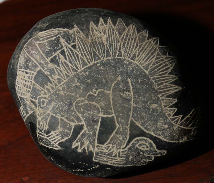 Еще один хорошо узнаваемый на камнях Ики вид – стегозавр Его невозможно спутать с другими видами из-за ряда спинных пластин, нескольких длинных хвостовых шипов и маленькой головы. Этот ящер относится к семейству стегозаврид и очень хорошо изучен палеонтологами, начиная с XIX в. Его существование относят ко времени 200 -150 млн. лет назад, т.е. ко второй половине юрского периода. Остатки этого семейства известны по раскопкам в Северной Америке и Китае. Стегозавр являлся травоядным ящером, однако на нескольких камнях он изображен в сценах схватки с человеком. На одном из камней выгравирован стегозавр, возможно, откусивший человеку голову (Фото 24). Этот ящер, весивший примерно 2-3 тонны, мог достигать в высоту 3,5-4 м, т.е. превышать по росту современного африканского слона. Но вызывает удивление сам факт того, что он изображен в схватке с человеком. Впрочем, подобные изображения типичны для комплекса изображений на камнях Ики. Как будет видно ниже, такой сюжет с травоядным динозавром, легко откусывающим голову человеку (охотнику), очень распространен. И это также свидетельствует, пусть и косвенно, в пользу подлинности изображений. Зачем предполагаемому фальсификатору изготавливать подделку с хорошо известным травоядным ящером, изображая из него опасного для человека хищника?