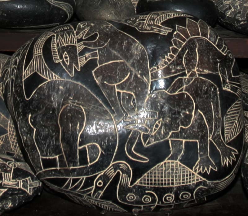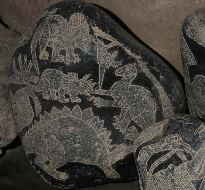 Например, то, что эти камни из собрания доктора Кабреры как раз и являются примером современных поделок. И хотя без лабораторных исследований установить это точно не возможно, для такого предположения есть целый ряд оснований. Во-первых, на большинстве камней Ики обычно не изображалось более двух разных видов динозавров. К тому же, если их несколько, они, как правило, включены в жанровую сцену, например, сцену охоты. На этих же двух камнях присутствуют рисунки различных видов животных, относящихся, к тому же, к разным геологическим периодам. Во-вторых, изображения данных динозавров отличаются от общепринятых в иконографии камней Ики канонов. Они гораздо более похожи на современные реконструкции древних ящеров. Кроме того, на втором камне можно заметить, что рисунки накладываются один на другой, что также не типично для комплекса гравированных камней. Данные соображения, конечно, не являются свидетельством современного происхождения двух описываемых камней, но привести их здесь я счел уместным.