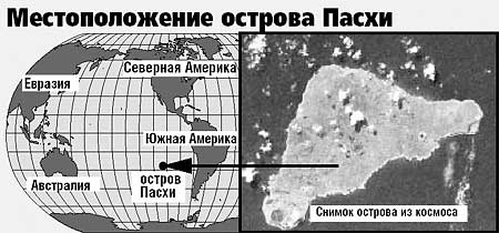 ГЕОГРАФИЧЕСКАЯ СПРАВКА. Остров Пасхи (принадлежит Чили с 1888 года, до этого — независимое королевство) считается самым отдалённым островом в мире: до побережья Чили — 3500 км, до острова Таити — 2000 км. На острове нет рек или пресных ручьёв, на нём находится 70 кратеров потухших вулканов, площадь о. Пасхи — 165,5 км, население — 2500 человек. Столица острова и единственный город — Анга-Роа.