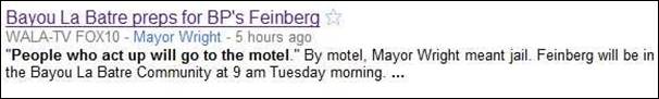 «Те, кто будут «устраивать сцены», отправятся в мотель». Под «мотелем» мэр Райт подразумевал тюрьму. Фейнберг прибудет в Баю Ла Батре в 9 утра во вторник». Источник: сайт телеканала «Fox 10 - Google News».