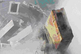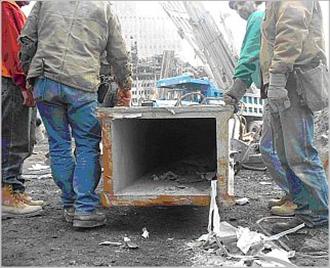 Отметьте, что эти центральные (прямоугольные в сечении) и внешние (квадратные в сечении) колонны явно принадлежали не к нижним частям Башен-Близнецов, а к верхним частям. Поэтому их пощадил странный процесс измельчения стали в порошок, которому подверглись нижние части структуры Башен, от которых не осталось ничего, кроме микроскопической стальной пыли.
