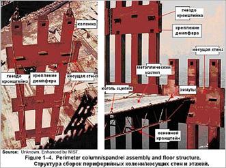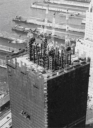 А вот ещё одна фотография — это из опубликованного доклада Национального Института Стандартов и Технологий («NIST») — по поводу 11 сентября. На этой фотографии хорошо видно как выглядели стальные колонны периметров Башен во время их возведения: