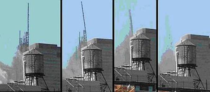 Эти две фотографии (ниже) показывают, как падала Северная Башня (она пала второй по счёту). Чётко видно, что Башня превратилась в мельчайшую пыль. Справа внизу чётко видно, что здание № 7 (красивое коричневое глянцевое здание) не было повреждено ни в малейшей мере.