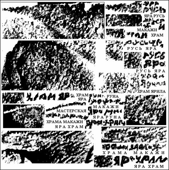 В нижней части данного фрагмента слева можно прочитать слова ХРАМ ЯРА, а на кончике головы в обращённом цвете — слова МАСТЕРСКАЯ ХРАМА МАКАЖИ.